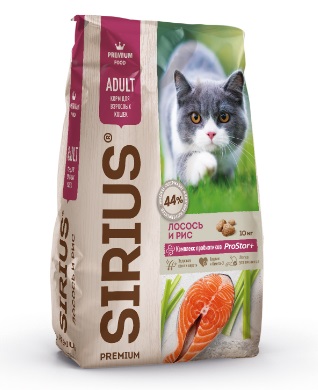 Корм Сириус "Лосось и рис" для кошек. Полноценный ежедневный рацион для взрослых кошек. Корм обогащен пробиотическим комплексом для повышения иммунитета. Не содержит пшеницу.